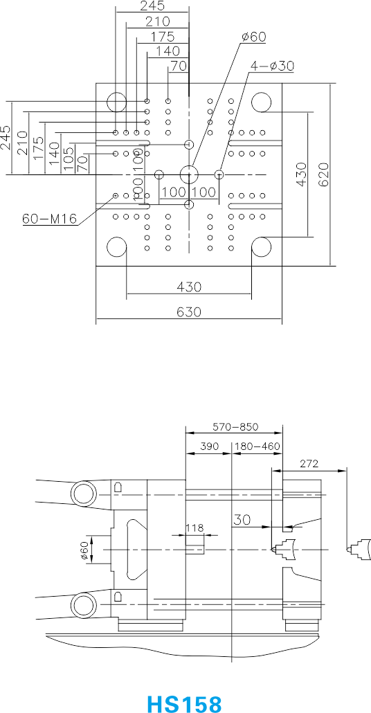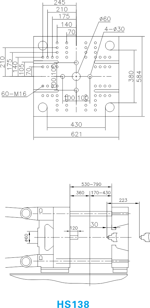 拉桿內(nèi)間距 | Tie-bars distance | mm | 370x370 | 430x380 | 430x430 | 480x480 | 515x475 | 530x530 | 575x575 | ||||||||||||||