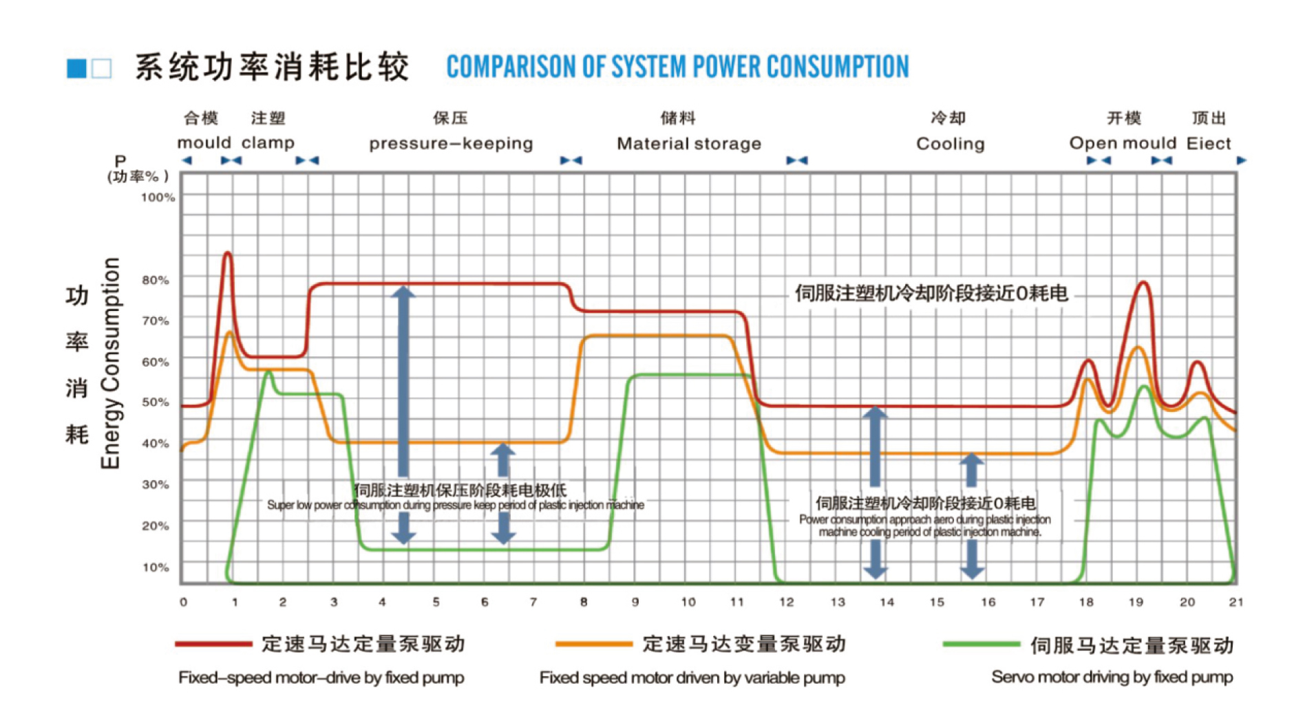 冷卻階段電機(jī)不工作,耗電為0。伺服節(jié)能注塑機(jī)相比傳統(tǒng)注塑機(jī)可節(jié)省20%-80%,給您帶來真正的綠色節(jié)能感受,經(jīng)濟(jì)效益顯著。